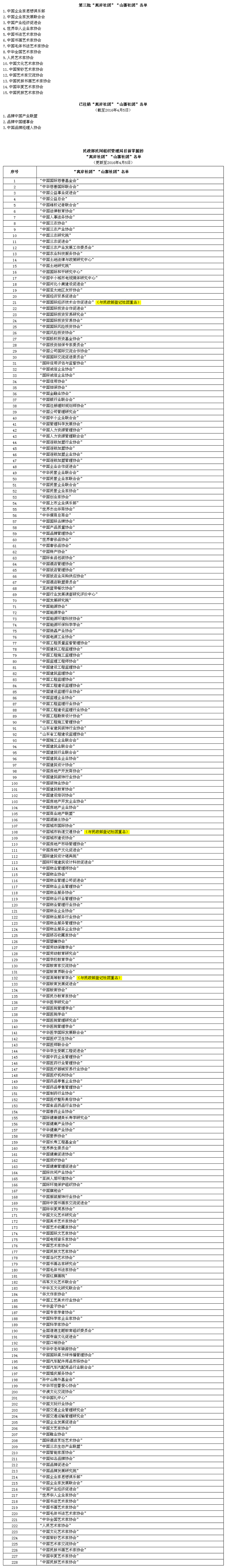 民政部现公布第三批“离岸社团”“山寨社团”名单,同时设立已注销“离岸社团”“山寨社团”名单。民政部将对名单进行动态管理,及时更新。一是对新发现的“离岸社团”“山寨社团”进行公布;二是将“品牌中国产业联盟”等主动向民政部提交已在香港等地注销证明文件的组织,列入已注销组织名单。欢迎社会公众继续向民政部提供“离岸社团”“山寨社团”的名单及活动线索,同时对已注销组织进行监督,如发现其中有继续以该组织名义开展活动或者提供不实材料的,请及时向民政部反映,民政部将依法处理。