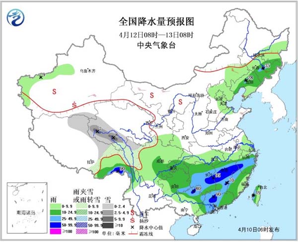 12日08时至13日08时,青海西南部、西藏北部、川西高原北部等地的部分地区有小雪到中雪或雨夹雪,其中青海西南部局地有大雪;东北地区东南部、西藏东南部、云南西北部、西南地区东部、江南、华南大部等地的部分地区有中到大雨,其中,湖南东部、江西中部、浙江西南部、广东中北部、广西东北部等地的部分地区有暴雨,局地大暴雨。新疆东部、内蒙古大部、东北地区中南部等地有4~6级风。新疆南疆盆地、内蒙古中西部、西北地区中东部等地有扬沙或浮尘。