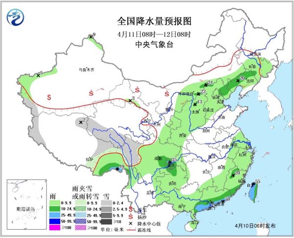 11日08时至12日08时,青海西南部、西藏东北部、川西高原西北部等地的部分地区有小雪或雨夹雪;新疆西部、西藏东南部、西北地区东部、内蒙古中部、华北大部、东北地区中南部、西南地区东部、云南东部、江南东部和南部、华南、台湾等地有小到中雨,其中,广东南部、台湾东部等地的部分地区有大雨,局地暴雨(50~70毫米)。新疆东部、内蒙古中西部、西北地区中东部、东北地区南部等地有4~6级风。新疆南疆盆地、内蒙古西部等地的部分地区有扬沙或浮尘。
