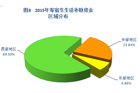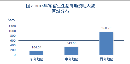 2015年,全国共有1476.78万家庭经济困难寄宿生享受生活费补助政策,政策覆盖率为51.84%。其中,西部地区968.79万人,覆盖率(占该地区寄宿生总数)达79.52%;中部地区343.65万人,覆盖率29.19%;东部地区164.34万人,覆盖率36.28%。