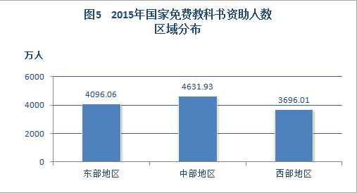 2015年,全国约1.24亿学生享受到国家免费教科书政策平均覆盖率为89.85%。其中,西部地区共资助3696.01万人,覆盖率为90.03%;中部地区共资助4631.93万人,覆盖率为87.87%;东部地区共资助4096.06万人,覆盖率为92.03%。