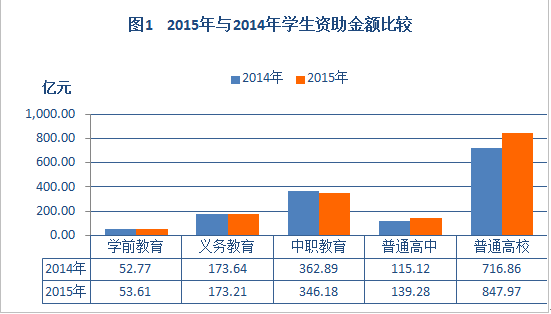 2015年,全国累计资助学前教育、义务教育、中职学校、普通高中和普通高校学生(幼儿)8433.31 万人次(不包括义务教育免费教科书和营养膳食补助),与上年基本持平;累计资助金额1560.25亿元,比上年增加138.97亿元,增幅9.78%。自2007年我国着力构建国家学生资助政策体系以来,资助资金连续九年保持高速增长。