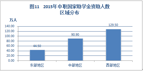 2015年,全国有264.90万中等职业学校学生享受国家助学金政策。其中,西部地区129.50 万人,占享受国家助学金人数总数的48.89%;中部地区90.90 万人,占34.31%;东部地区44.50万人,占16.80%。