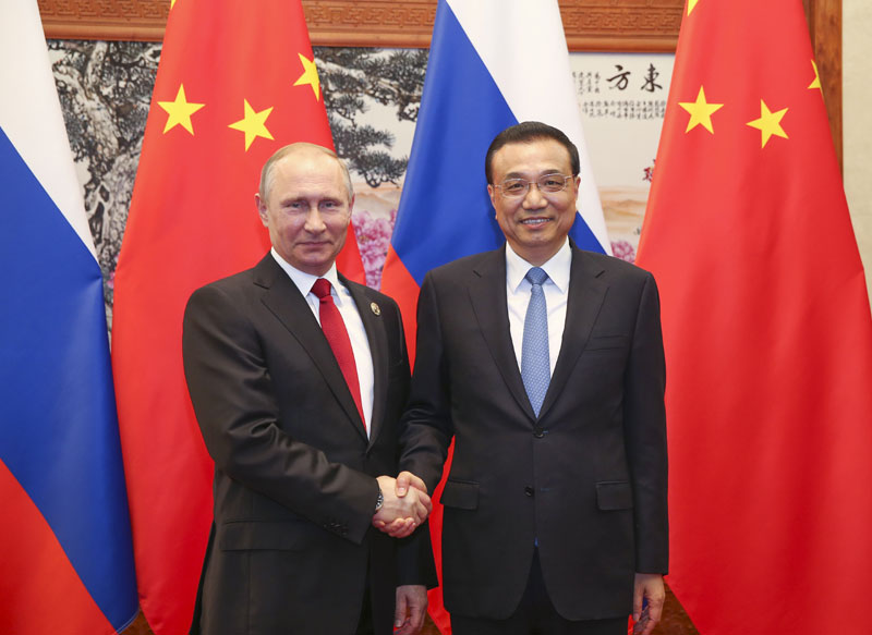 国务院总理李克强5月14日下午在人民大会堂会见来华出席“一带一路”国际合作高峰论坛的俄罗斯总统普京。