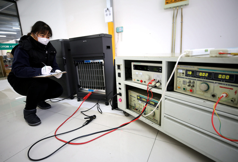 2月7日,河北大厂一家企业的工作人员在对医用空气消毒机进行测试。