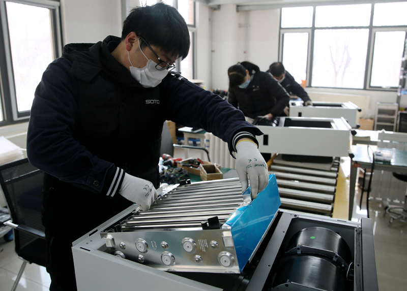 2月7日,河北大厂一家企业的工作人员在组装医用空气消毒机。