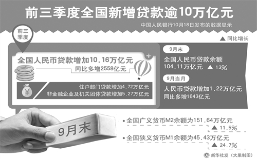 9月份人民币贷款增加1.22万亿元,同比多增1643亿元