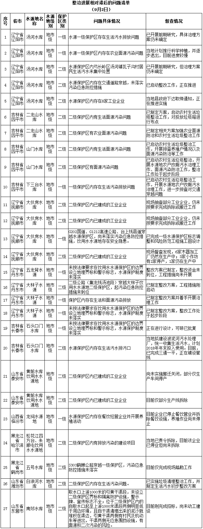 9月2日,全国集中式饮用水水源地环境保护专项第二轮督查工作继续开展,各督查组共现场检查38个饮用水水源地171个环境问题整治情况。从检查情况看,87个问题已整改完成并销号,完成比例为51%;其余84个问题正在整改过程中,尚未发现清理整治“零”进展的问题。