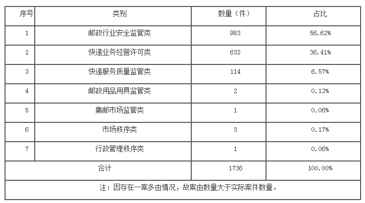 按照邮政市场行政处罚案件类别统计,七类案件数量依次为:邮政行业安全监管类983件,快递业务经营许可类632件,快递服务质量监管类114件,邮政用品用具监管类2件,集邮市场监管类1件,市场秩序类3件,行政管理秩序类1件。