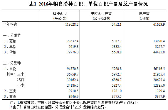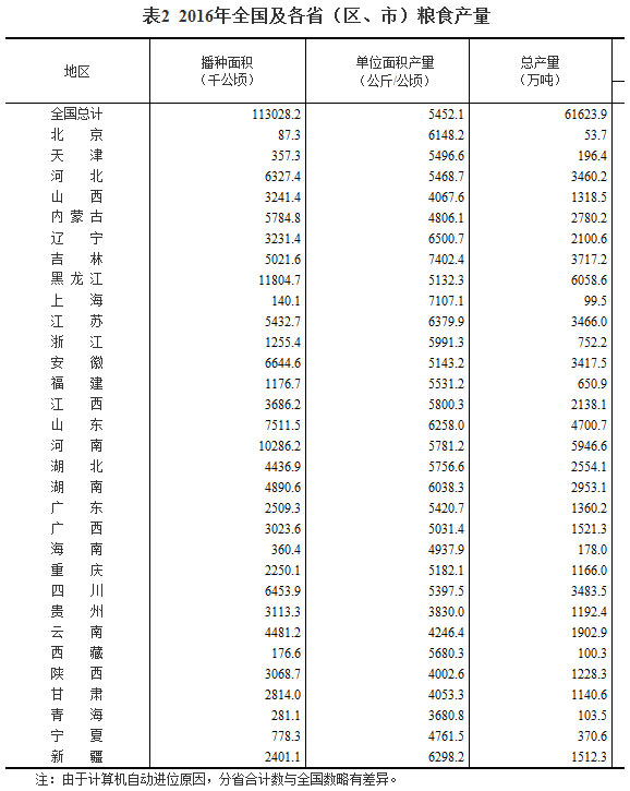 根据国家统计局对全国31个省(区、市)农业生产经营户的抽样调查和农业生产经营单位的全面统计,2016年全国粮食播种面积、单位面积产量、粮食总产量如下: